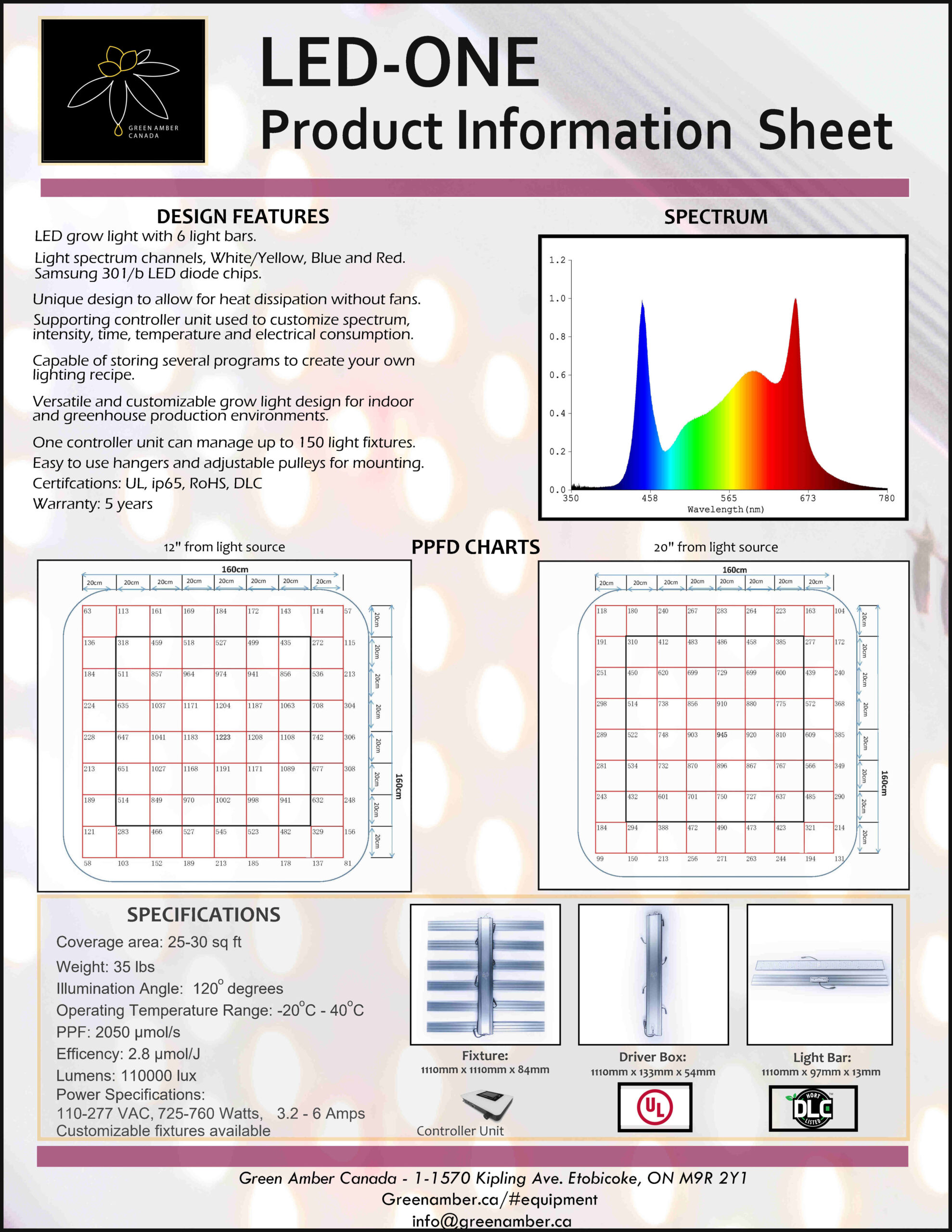 The LED-ONE customizable agricultural LED grow light was designed by Green Amber Canada for any agricultural indoor or greenhouse environment.